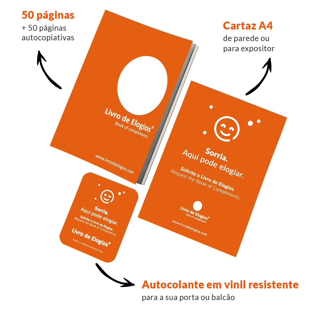 Ao adquirir o Livro de Elogios em formato físico, recebe de oferta um cartaz A4 e um autocolante em vinil para o vidro do seu estabelecimento.
