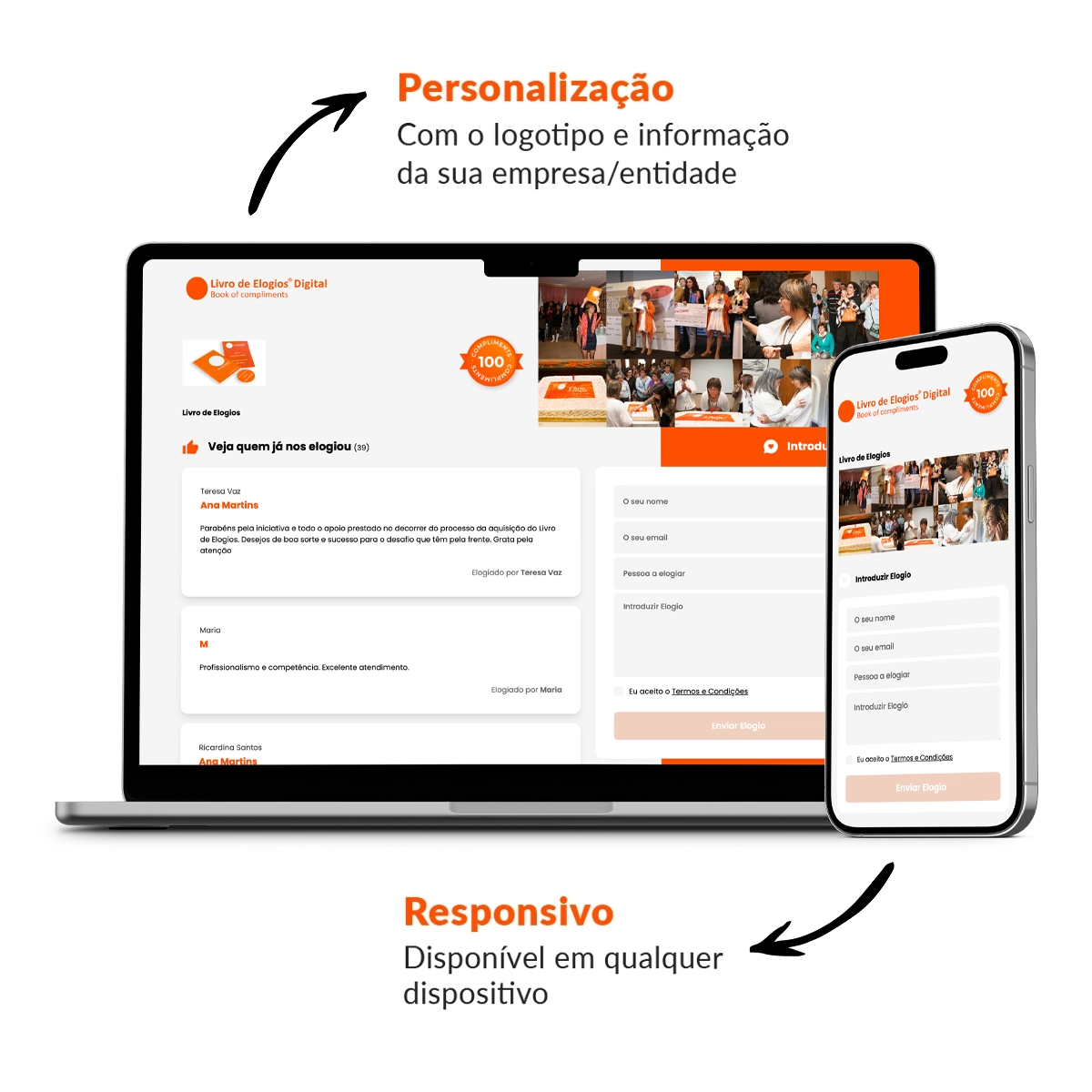 Com o Pack Livro de Elogios em Papel + Digital, recebe um livro físico e uma página online exclusiva da sua empresa, onde os seus clientes/utentes podem escrever elogios, ver os elogios que já tem e partilhar os elogios nas redes sociais.